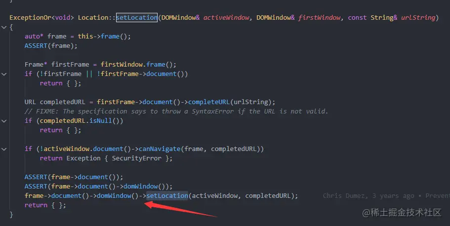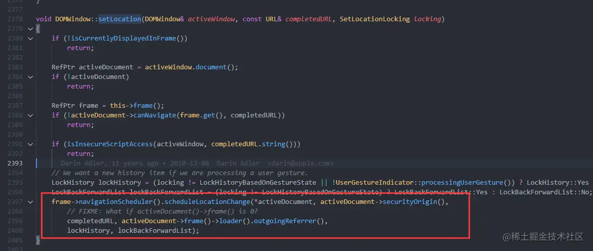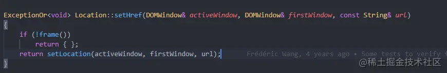 - Location相关的模块文件在webkit\WebKit\Source\WebCore\page\Location.cpp,大家在这个文件下可以看到我们经常使用的location对象的常用属性,我们在通过为location.href赋值跳转,内部是使用的setHref方法。下图中所标注的代码行语法上概要理解成又回到了我们上面提到的DOMWindow,对象下的setLocation方法调用