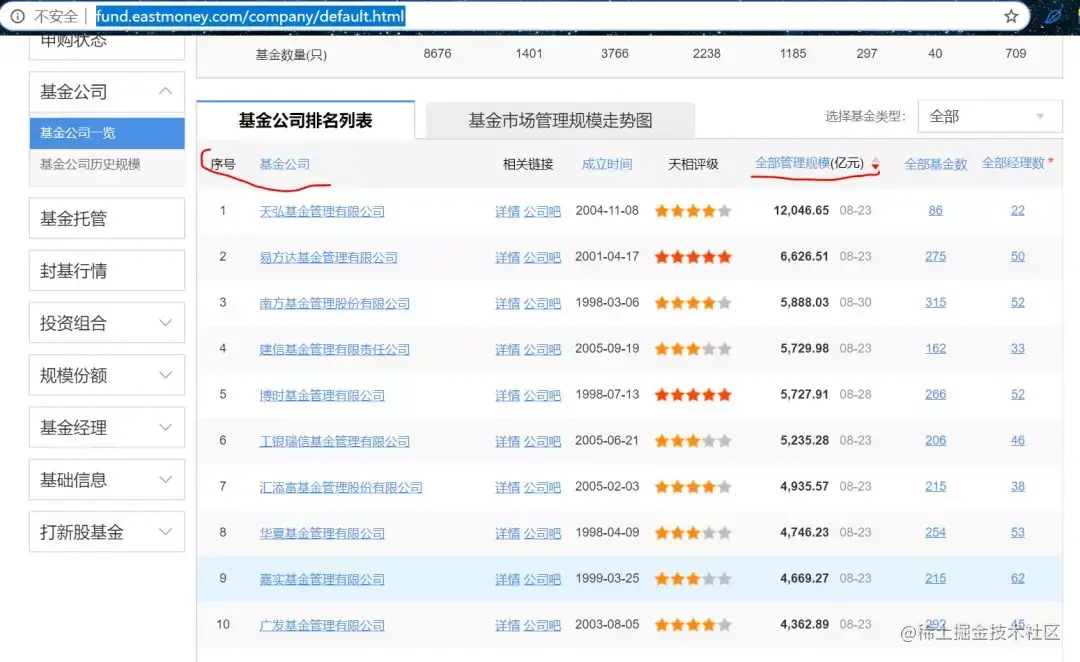 从这个网页中提取排名序号,公司名,管理规模,保存到 csv