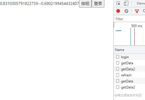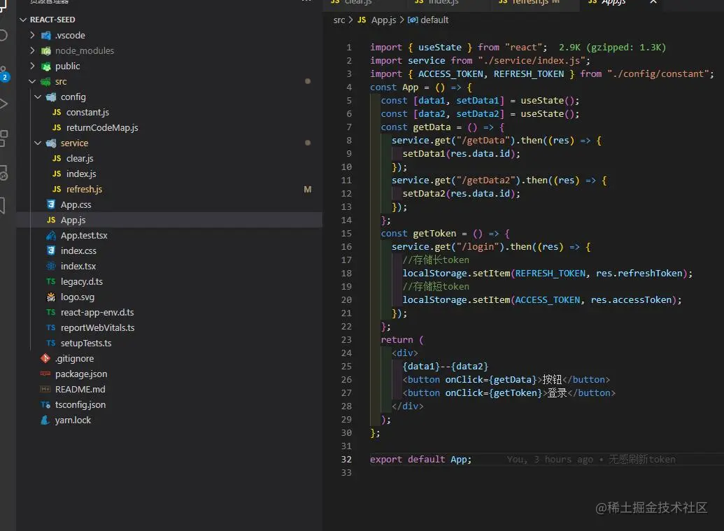 import { useState } from 'react';import service from './service/index.js';import { ACCESS_TOKEN, REFRESH_TOKEN } from './config/constant';const App = () => { const [data1, setData1] = useState(); const [data2, setData2] = useState(); const getData = () => { service.get('/getData').then((res) => { setData1(res.data.id); }); service.get('/getData2').then((res) => { setData2(res.data.id); }); }; const getToken = () => { service.get('/login').then((res) => { //存储长token localStorage.setItem(REFRESH_TOKEN, res.refreshToken); //存储短token localStorage.setItem(ACCESS_TOKEN, res.accessToken); }); }; return ( <div> {data1}--{data2} <button onClick={getData}>按钮</button> <button onClick={getToken}>登录</button> </div> );};export default App;