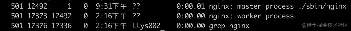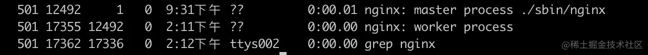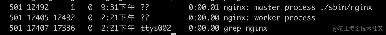 启动nginx,使用ps -ef | grep nginx查看nginx进程,如图2所示,关于nginx的进程有两个,一个是master进程,一个是worker进程。