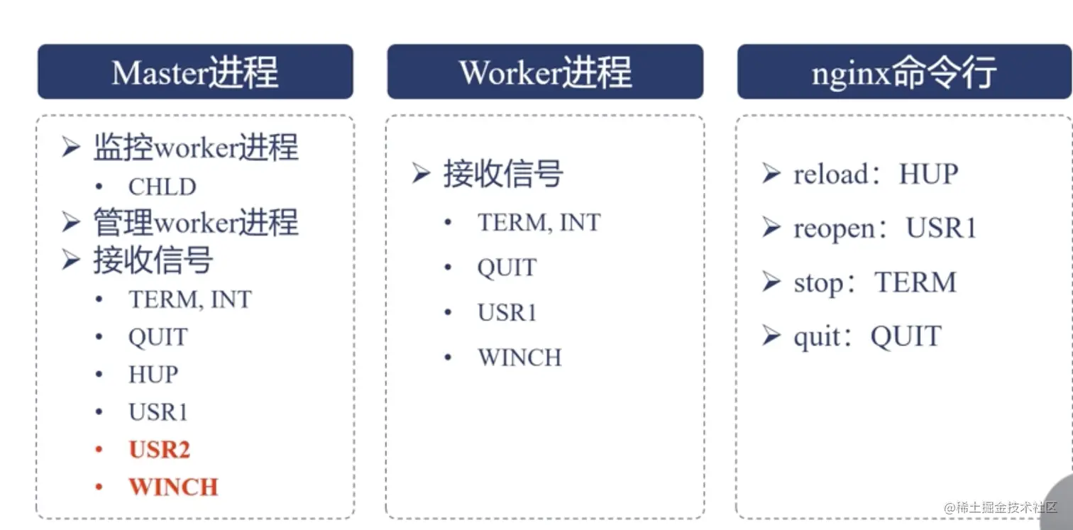 同master进程的接收信号,但是不建议对worker进程发起信号,因为希望由master进程去管理worker进程。