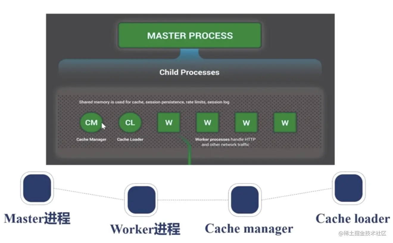 - Worker:Worker进程是真正用来处理请求的进程。缓存要在多个Worker进程之间共享,并且还要被CM、CL使用。