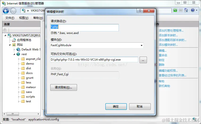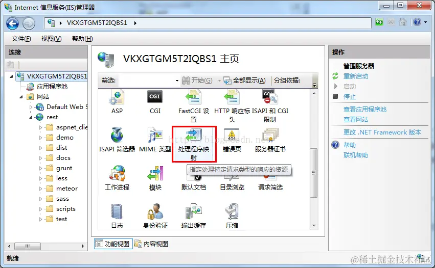 添加完成后在运行出输入iis 打开iis管理器,在功能视图中选择处理程序映射,如图