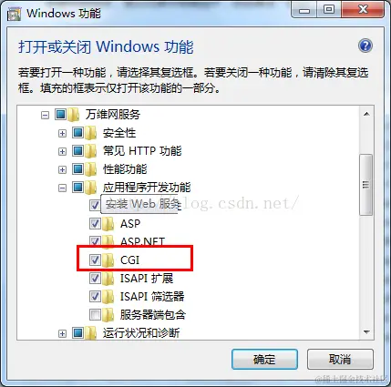 最后配置IIS。打开电脑程序和功能,添加CGI 如果已经有的看一眼跳过这一步,如图