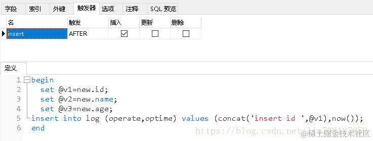mysql 触发器略解 存储过程 函数 小柳888 2021-10-26 98 阅读1分钟 student 表数据放生变化时 ,log表记录相应操作 navicate 中 db_student表结构 \ tb_log \ \ \