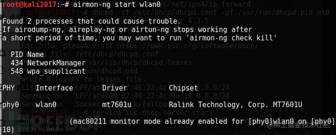 然后是使用airmon-ng工具启动无线网卡,主要为了下一步建立无线站点。