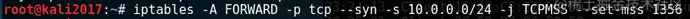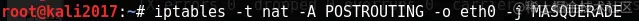 特别注意大写的那些名称,一旦输错就会报错的还以为是命令有问题。这里我也不清楚这句命令的意思,找找度娘:POSTROUTING代表的是原地址,我估计-A是指所有,然后上网的时候转换成eth0的地址,根据路由的理解也是这样,因为kali两张网卡eth0可以上网,而at0作为虚拟网卡要想通过eth0上网也必然需要通过eth0接口地址进行SNAT原地址转换。