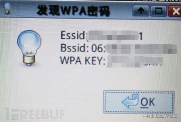 下面进行爆破,这个过程根据之前的准备工作以及运气,运气不错,爆破成功! 如下图所示,WPA KEY部分就是无线密码。