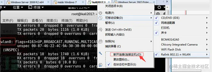 2、设置网卡模式,需要先将无线网卡插入USB口并映射到kali虚拟机。网卡映射如下图所示已经识别到网卡wlan0