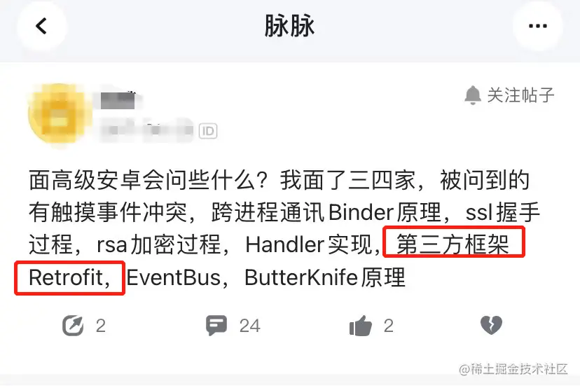 Retrofit + OkHttp + RxJava是目前比较潮的一套框架。但这套框架其实是有一定门槛的,尤其是Retrofit的核心原理掌握。和OkHttp一样,Retrofit现在也是大厂面试的必会问题之一: