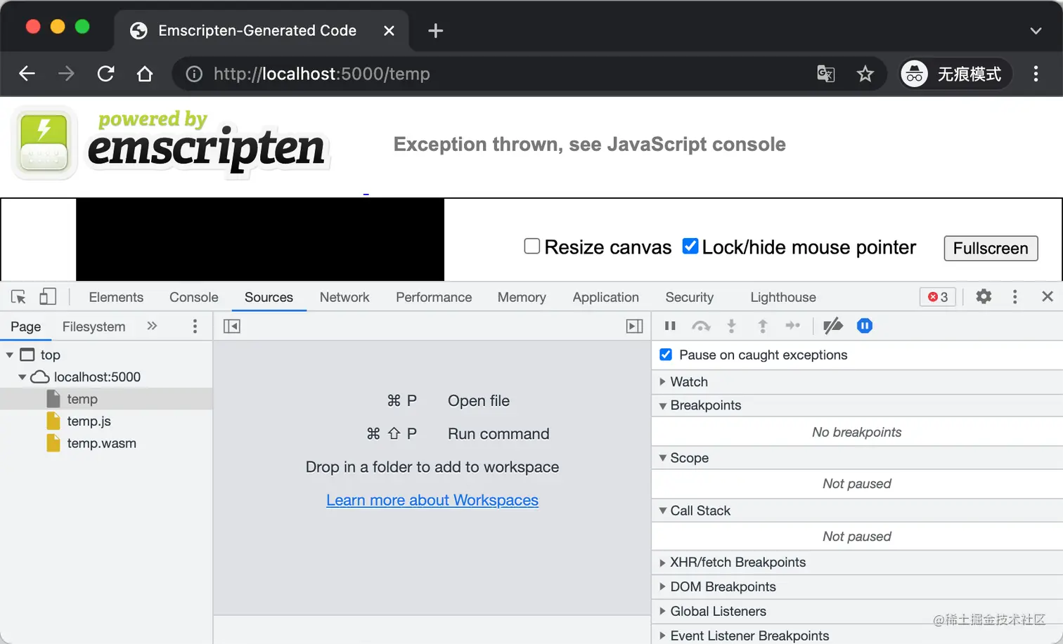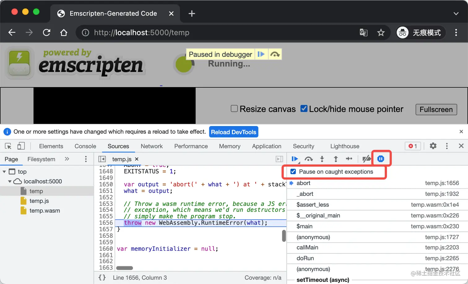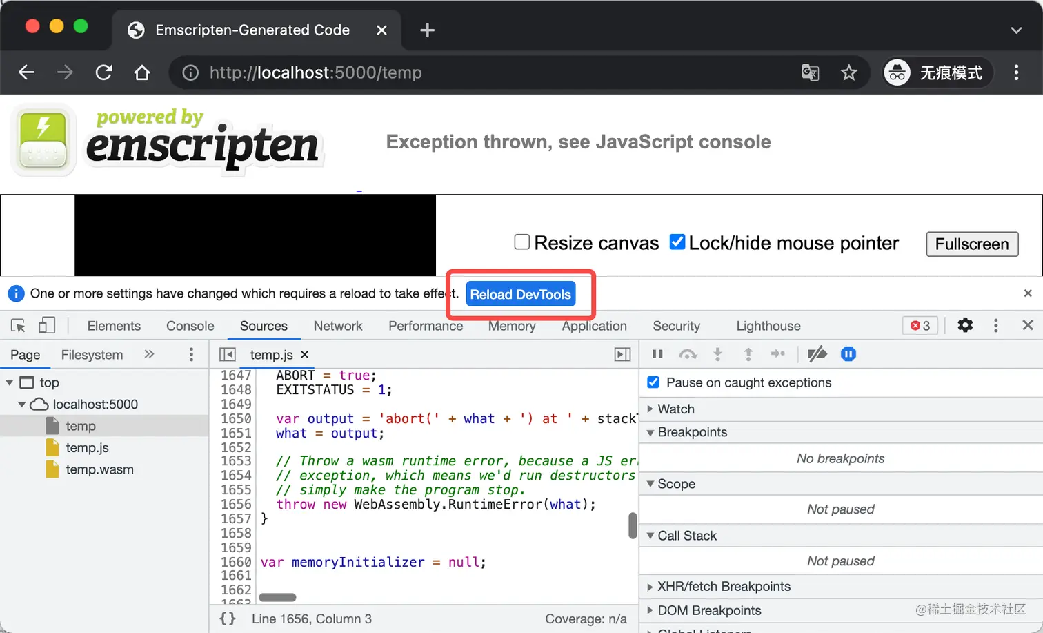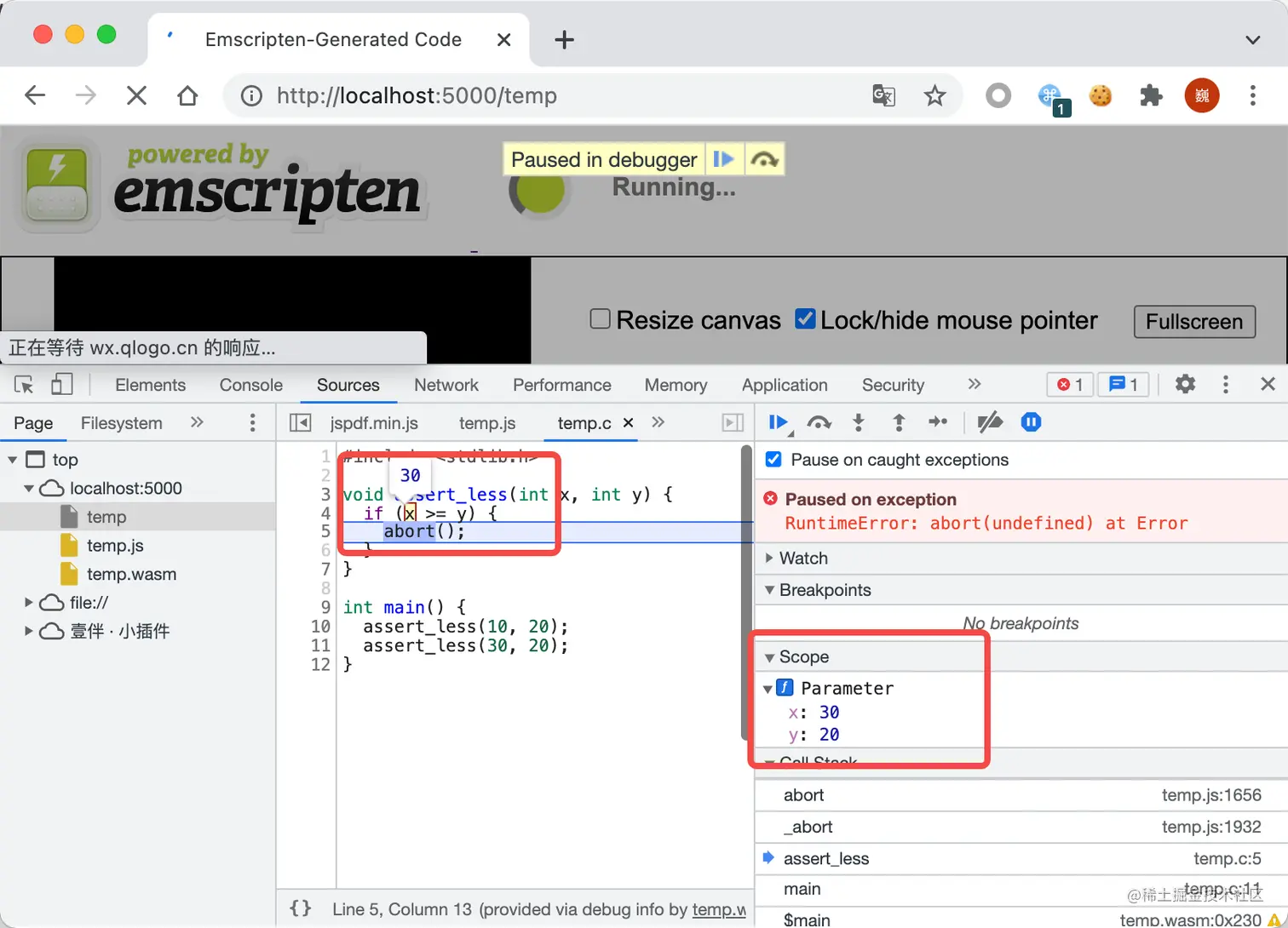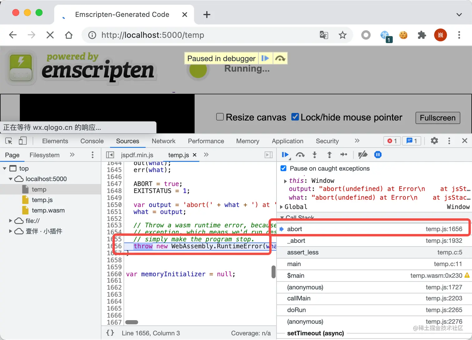 temp.js,由 Emscripten 编译生成的 JS 胶水代码,然后顺着调用栈去找,可以查看到temp.c并定位到抛出异常的位置: