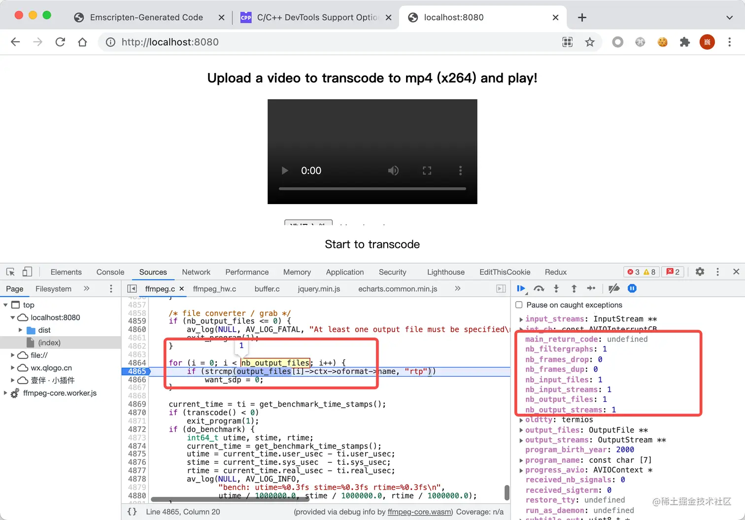 可以看到,我们在 Sources 面板里面可以搜索到构建后的 ffmpeg.c 文件,我们可以在 4865 行,在循环操作 nb_output 时打一个断点: