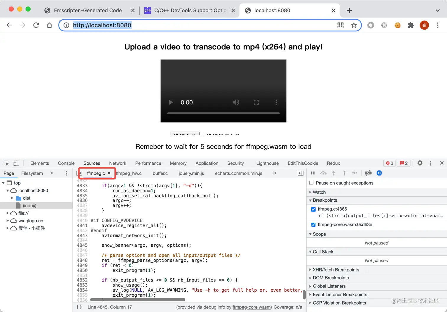 在浏览器中调试 ffmpeg 代码