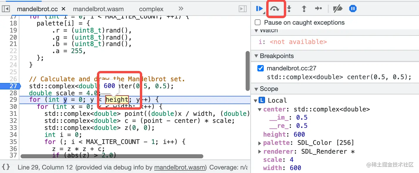 在之前我们只编译了 mandelbrot.cc 文件,并在编译时要求 Emscripten 为我们提供内建的 SDL 相关的库,由于 SDL 库并不是我们从源码编译而来,所以不会带上调试相关的信息,所以我们仅仅在 mandelbrot.cc 里面可以通过查看 C++ 代码的形式来调试,而对于 SDL 相关的内容则只能查看 WebAssembly 相关的代码来进行调试。