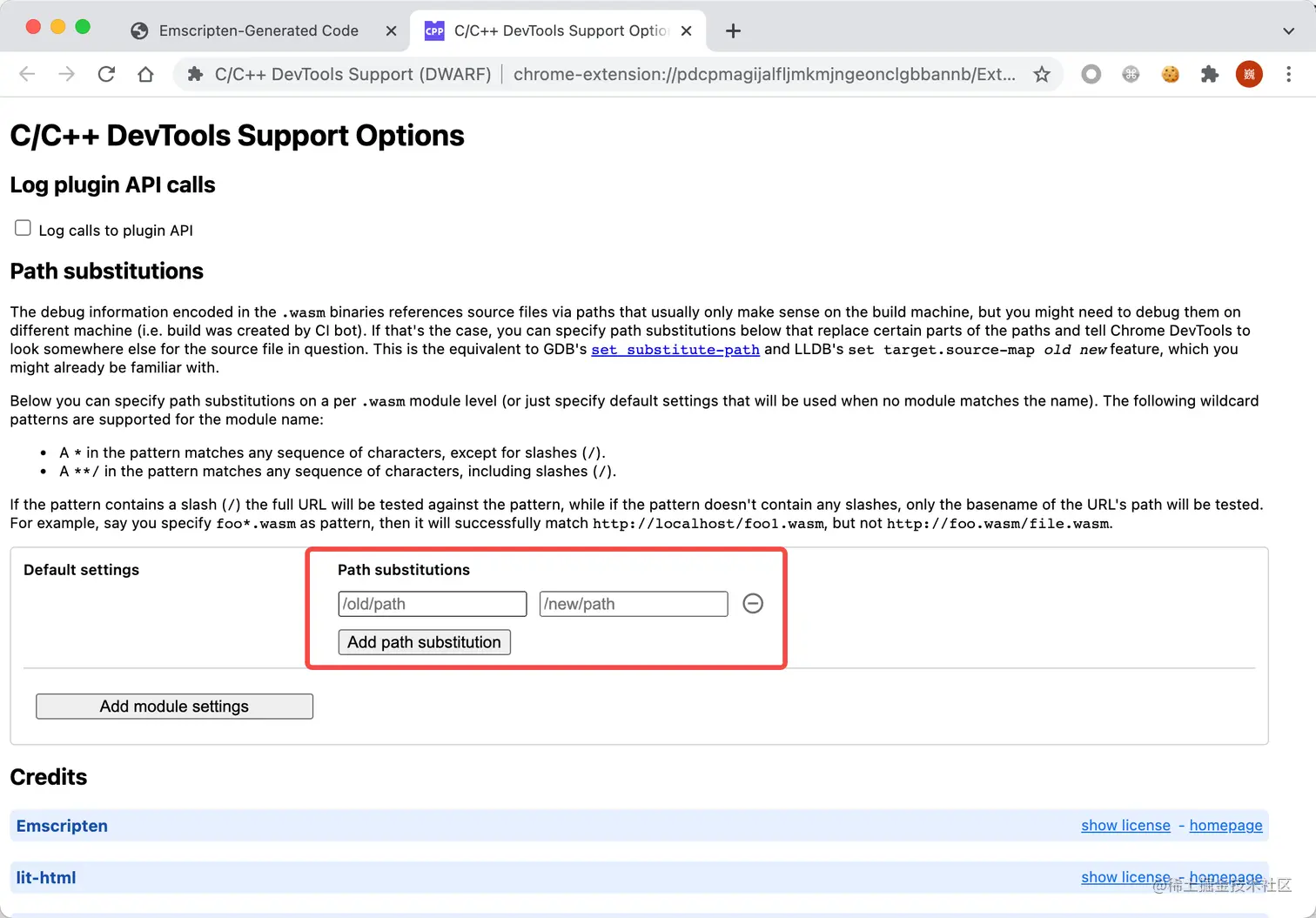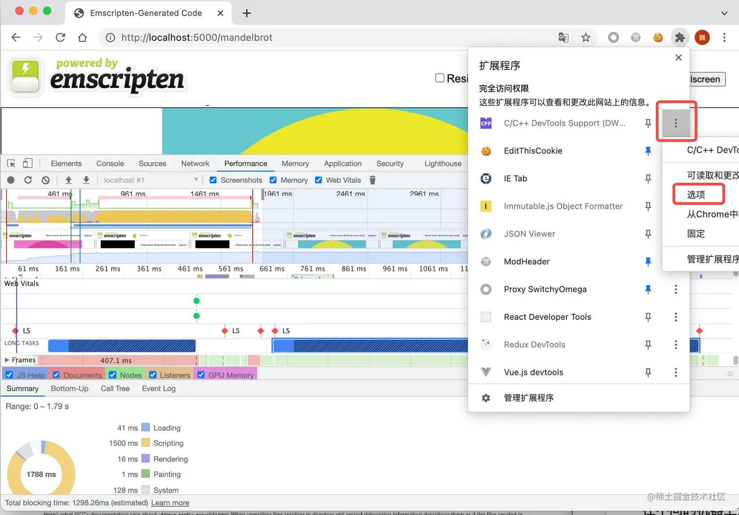 而 C/C++ 到 WebAssembly 代码的编译器 Emscripten 则支持在编译时,为代码注入相关的调试信息,生成对应的 source map,然后安装 Chrome 团队编写的 C/C++ Devtools Support 浏览器扩展,就可以使用 Chrome 开发者工具调试 C/C++ 代码了。