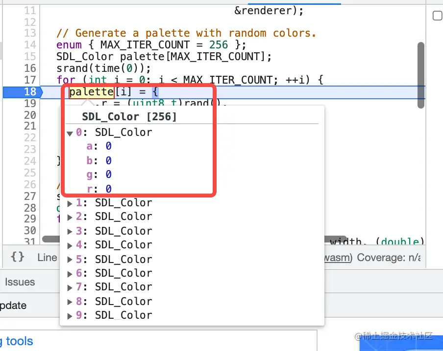 上述代码差不多 50 行左右,但是引用了两个 C++ 标准库:SDL 和 complex numbers ,这使得我们的代码变得有一点复杂了,我们接下来编译上述代码,来看看 Chrome Devtools 的调试效果如何。