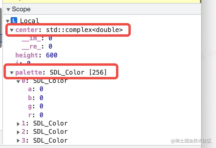 实际上 Chrome Devtools 不仅可以查看原 C/C++ 代码中一些变量的普通类型值,如数字、字符串,还可以查看更加复杂的结构,如结构体、数组、类等内容,我们拿另外一个例子来展现这个效果。