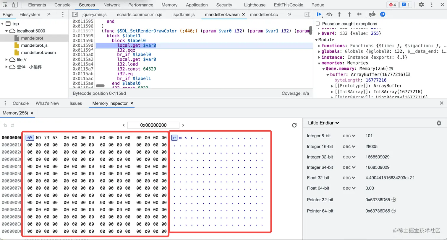 从内存面板里面可以查看以十六进制或 ASCII 的形式查看 WebAssembly 的内存,导航到特定的内存地址,将特定数据解析成各种不同的格式,如十六进制 65 代表的 e 这个 ASCII 字符。