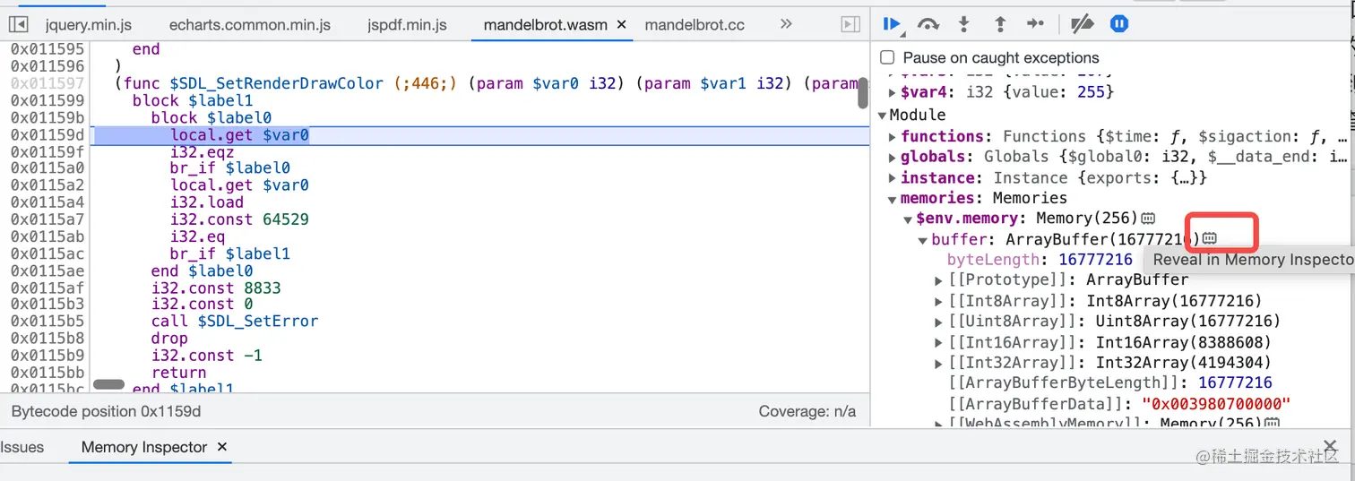 如果想要调试此时程序占用的内存相关的内容,可以在 WebAssembly 的上下文下,查看 Scope 面板里的 Module.memories.$env.memory ,但是这只能看到一些独立的字节,无法了解到这些字节对应到的其他数据格式,如 ASCII 格式。但是 Chrome 开发者工具还为我们提供了一些其他更加强大的内存查看形式,当我们右键点击 env.memory 时,可以选择 Reveal in Memory Inspector panel: