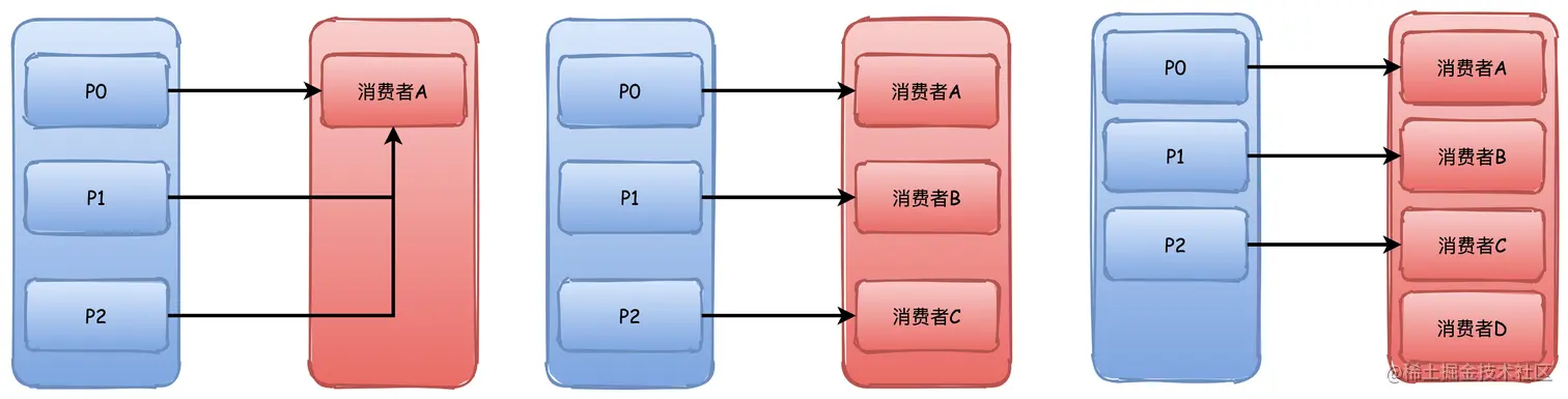 比如有3个分区,消费者A排序更靠前,所以能够分配到P0\P1两个分区,消费者B就只能分配到一个P2。