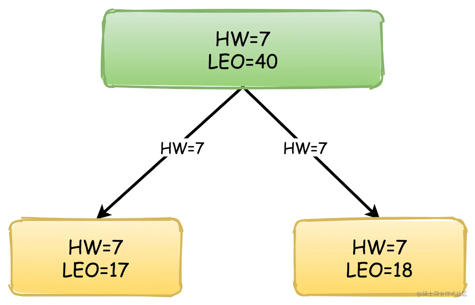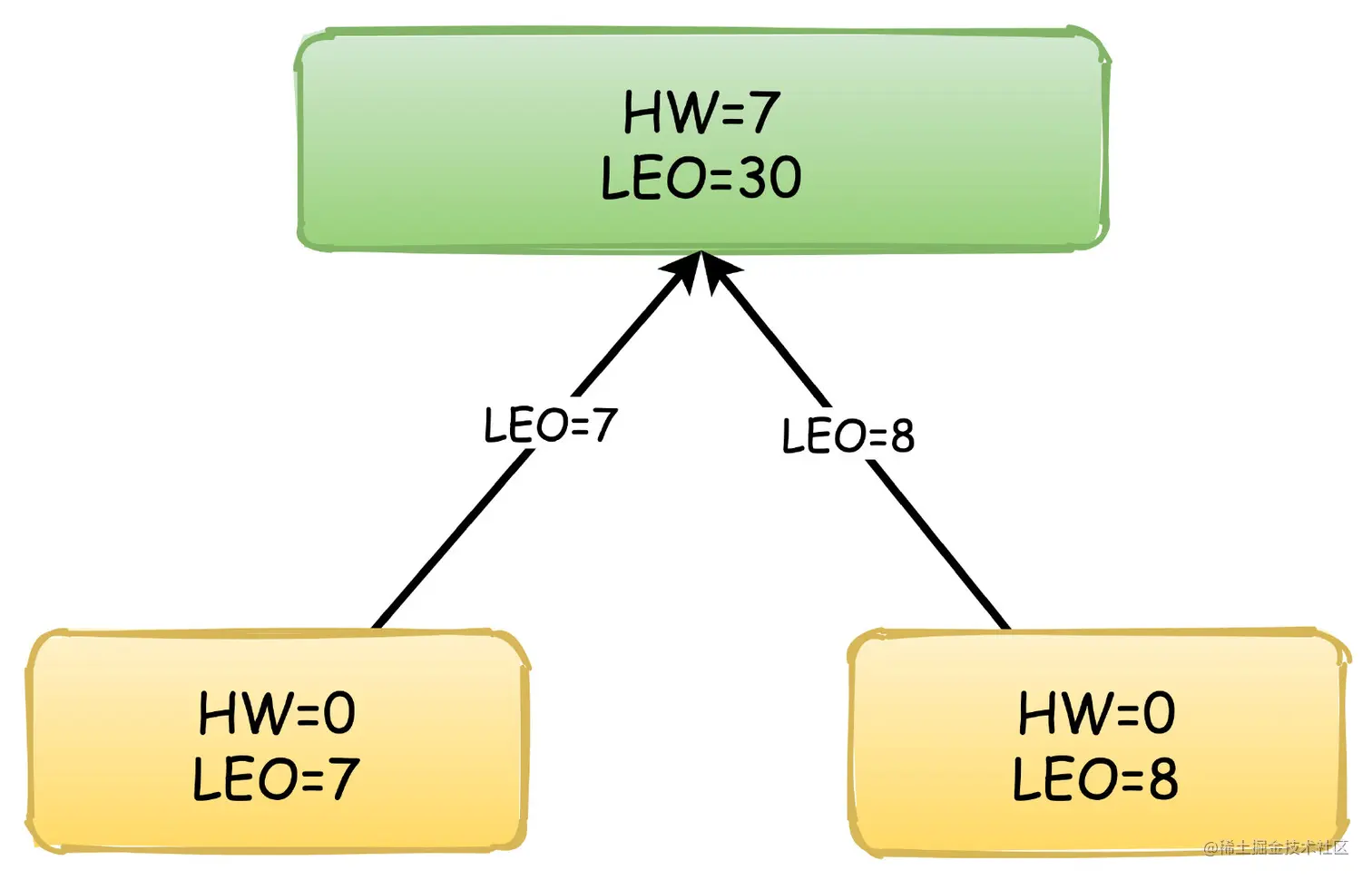 然后,消息还在继续写入,Leader的LEO值又发生了变化,两个Follower也各自拉取到了自己的消息,于是更新自己的LEO值,但是这时候Leader的HW依然没有改变。
