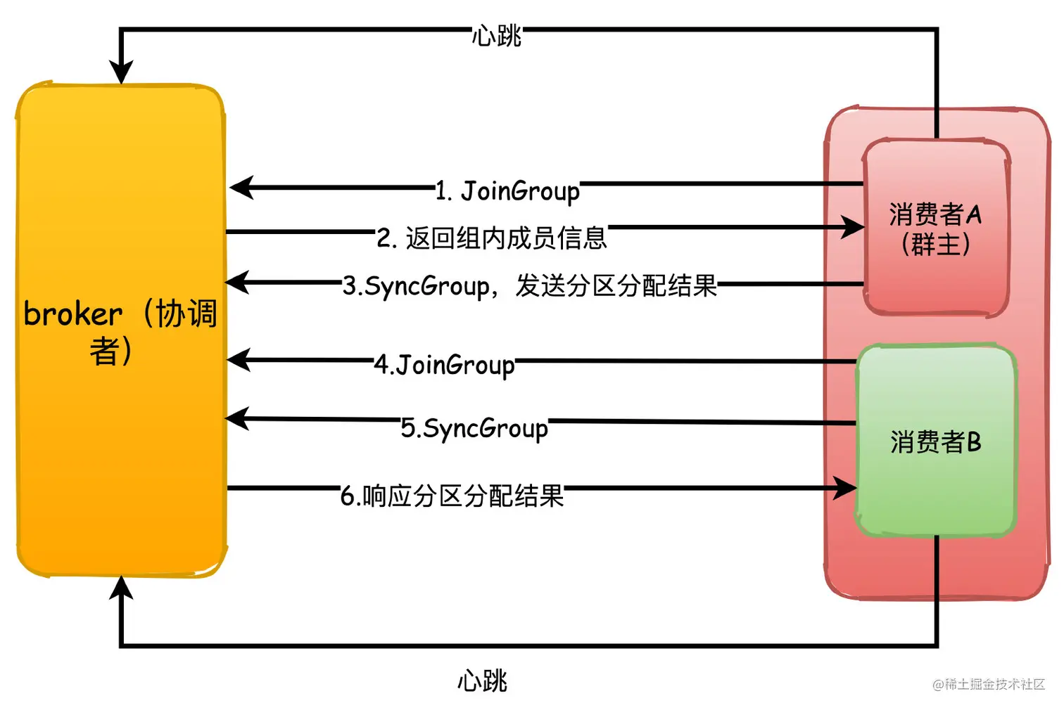 JoinGroup请求,第一个发送这个请求的消费者会成为“群主”,协调者会返回组成员列表给群主 - 群主执行分区分配策略,然后把分配结果通过