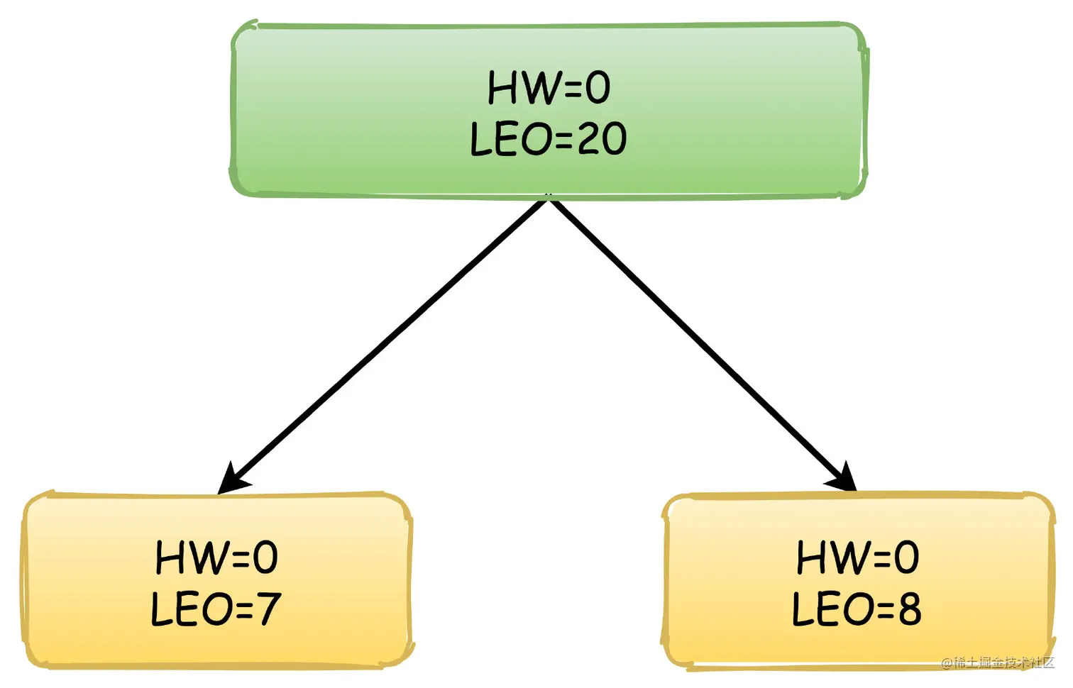 首先,生产者不停地向Leader写入数据,这时候Leader的LEO可能已经达到了10,但是HW依然是0,两个Follower向Leader请求同步数据,他们的值都是0。