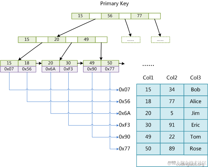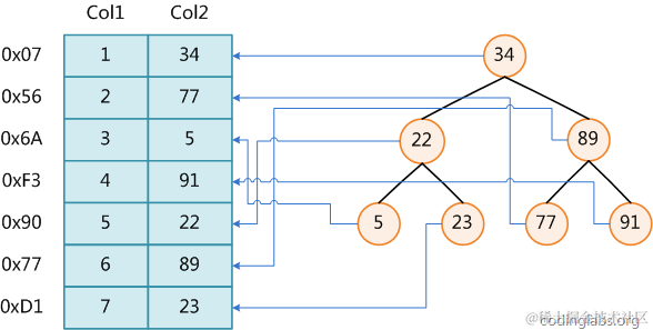 图1展示了一种可能的索引方式。左边是数据表,一共有两列七条记录,最左边的是数据记录的物理地址(注意逻辑上相邻的记录在磁盘上也并不是一定物理相邻的)。为了加快Col2的查找,可以维护一个右边所示的二叉查找树,每个节点分别包含索引键值和一个指向对应数据记录物理地址的指针,这样就可以运用二叉查找在O(log2n)O(log2n)的复杂度内获取到相应数据。