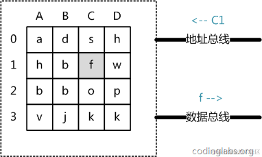 从抽象角度看,主存是一系列的存储单元组成的矩阵,每个存储单元存储固定大小的数据。每个存储单元有唯一的地址,现代主存的编址规则比较复杂,这里将其简化成一个二维地址:通过一个行地址和一个列地址可以唯一定位到一个存储单元。图5展示了一个4 x 4的主存模型。
