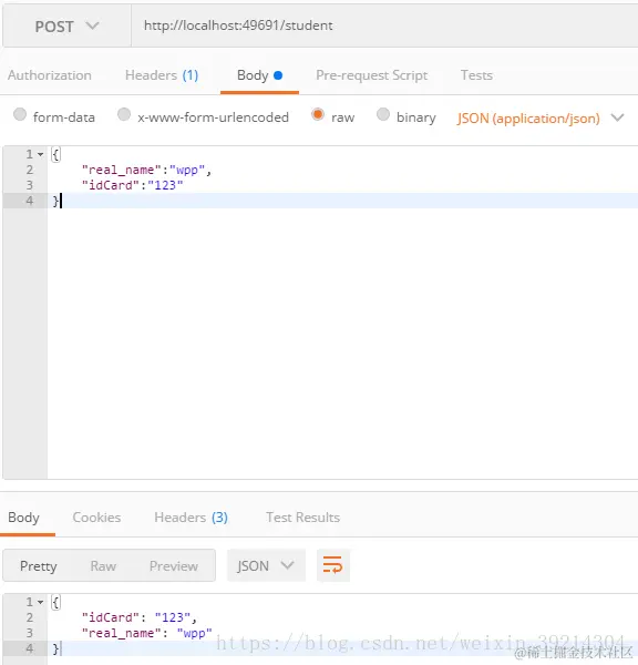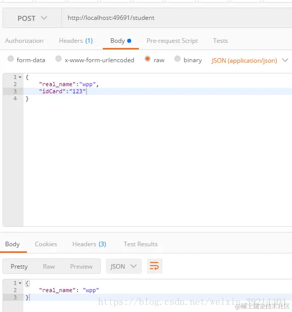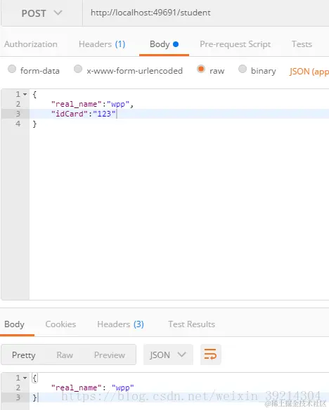 Postman测试如下(条件:正常输入real_name和idCard,观察返回数据,只包含real_name)
