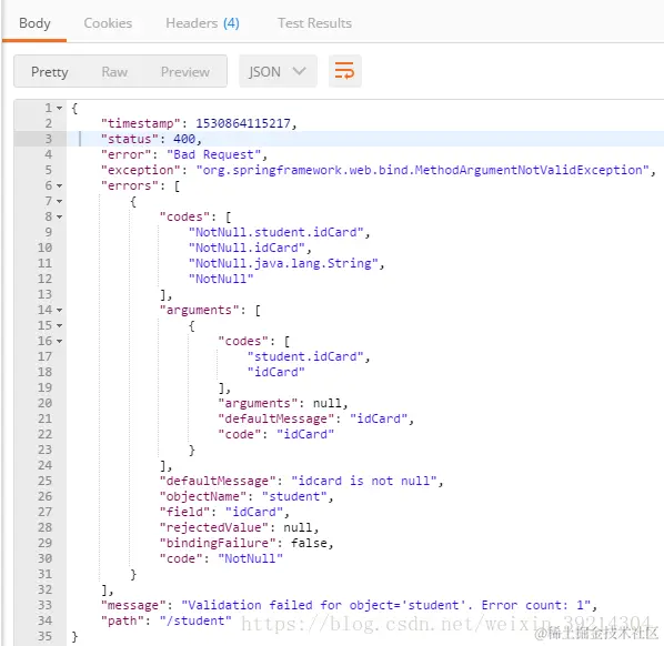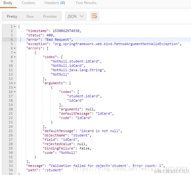 Postman测试结果如下(条件:idCard及为上述特殊字段,结果报错)