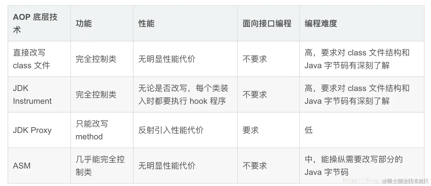 最后,我们比较一下 ASM 和其他实现 AOP 的底层技术: