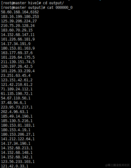 接下来做个简单的统计查询,查询ip访问次数降序排列(此处是把结果输出到本地文件系统的目录 /usr/tools/hive/output目录,字段之间用,号分割显示)
