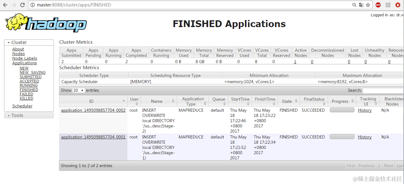 也可以通过hadoop的web管理页面查看mapreduce的运行情况