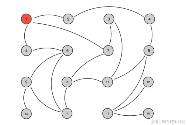 这里一共有 16 个节点,节点 1 为初始被感染节点,通过 Gossip 过程,最终所有节点都被感染: