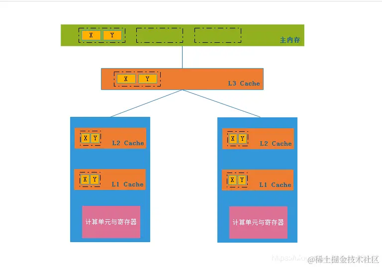 由上图可以得知,如果寄存器想要得到存储在内存的数据是需要经历三层(不同cpu不同层,一般是三层)缓存,先进入L3再进入L2再进L1。