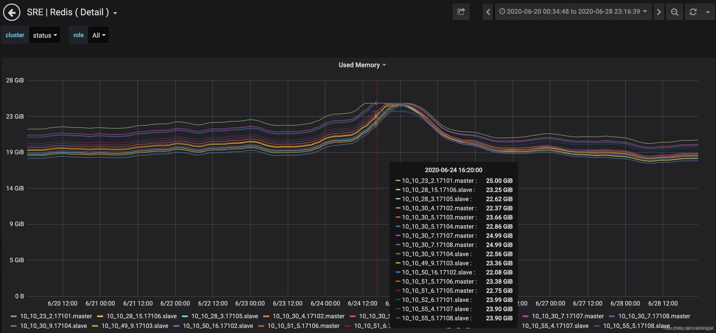 对比下图的 redis 最大内存配置,会发现 8 个分片的主库内存在 2020.06.24 12:00 - 2020.06.25 03:00 期间都触达了最大值