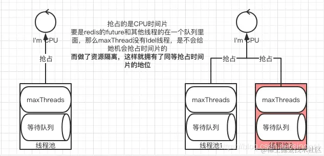 隔离了这种线程池的资源,这样对redis这种快速的线程就不会被队列中慢的线程影响获取时间片