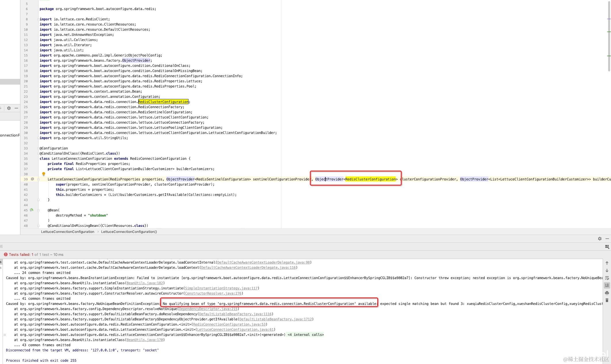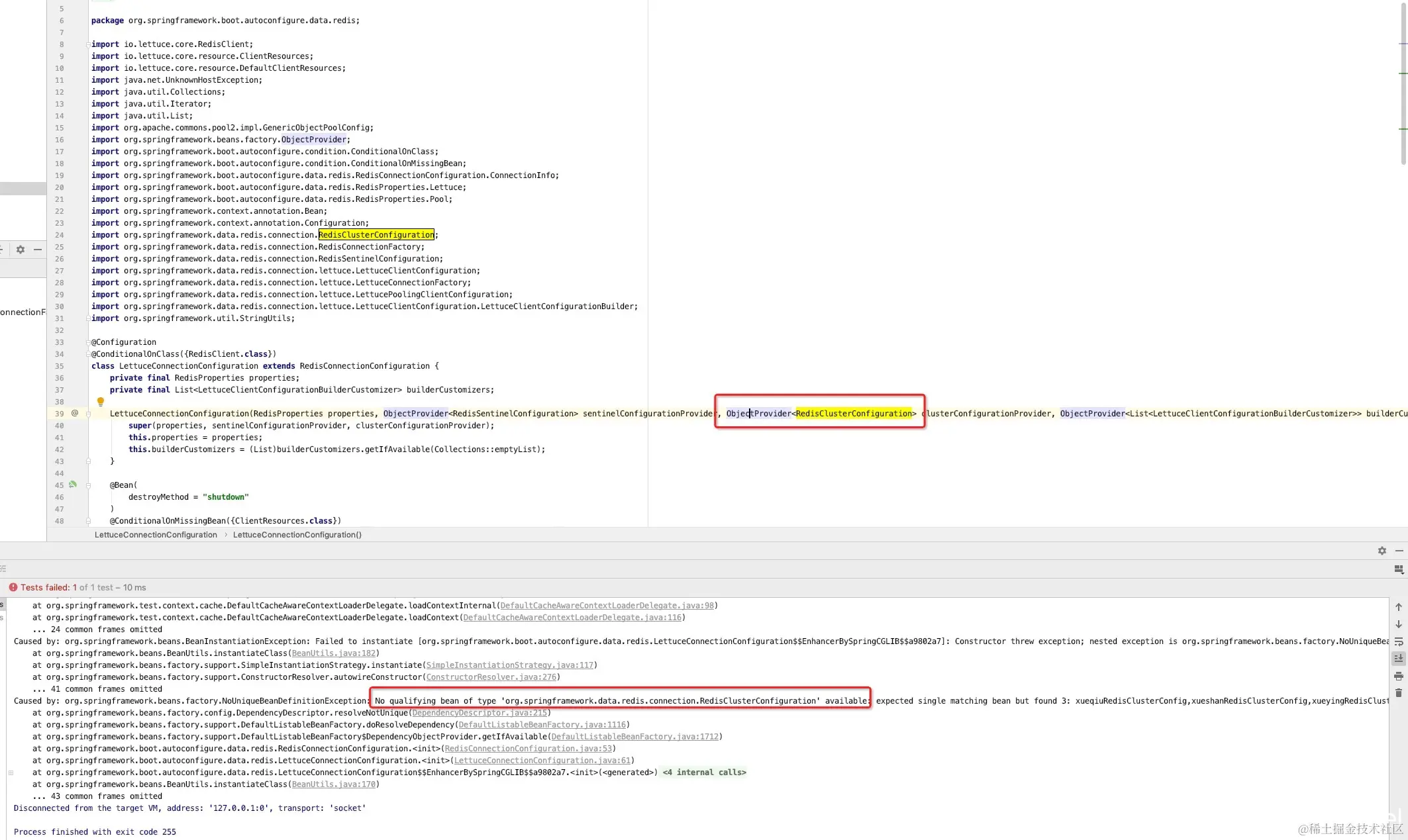 spring里面我这个使用的是lettuce,他的内部类LettuceConnectionConfiguration在调用RedisClusterConfiguration使用的是byType方式注入,会出现bean错误,使用的jedis 我猜应该也是会存在同样的问题