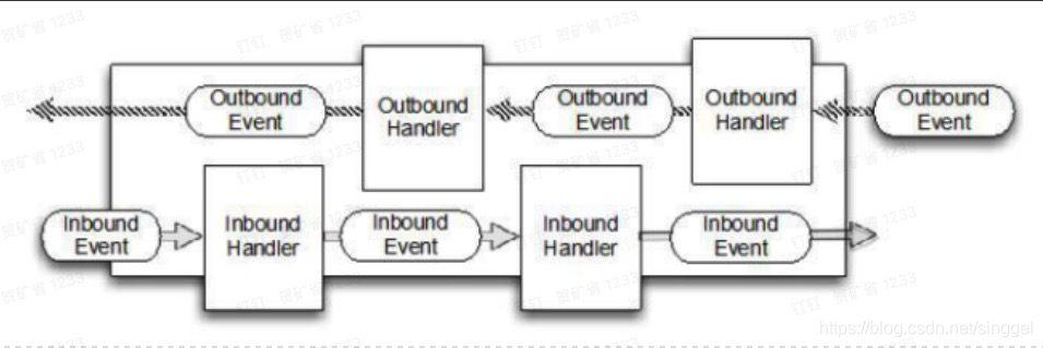 入站事件和出站事件在一个双向链表中,入站事件会从链表 head 往后传递到最后一个入站的 handler,出站事件会从链表 tail 往前传递到最前一个出站的 handler,两种类型的 handler 互不干扰