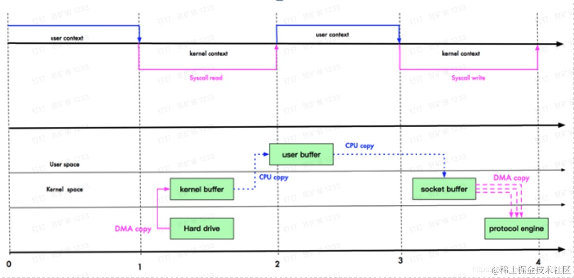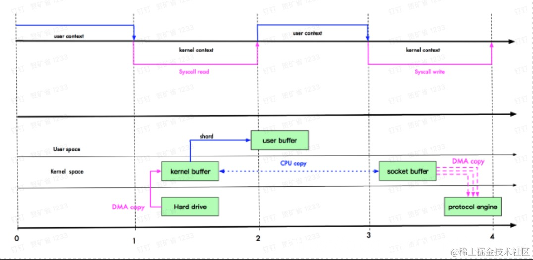 Linux 在 2.4 版本中,做了一些修改,避免了从内核缓冲区拷贝到 Socket buffer 的操作,直接拷贝到协议栈,从而再一次减少了数据拷贝。具体如下图和小结: 这里其实有 一次cpu 拷贝 kernel buffer -> socket buffer 但是,拷贝的信息很少,比如 lenght , offset , 消耗低,可以忽略