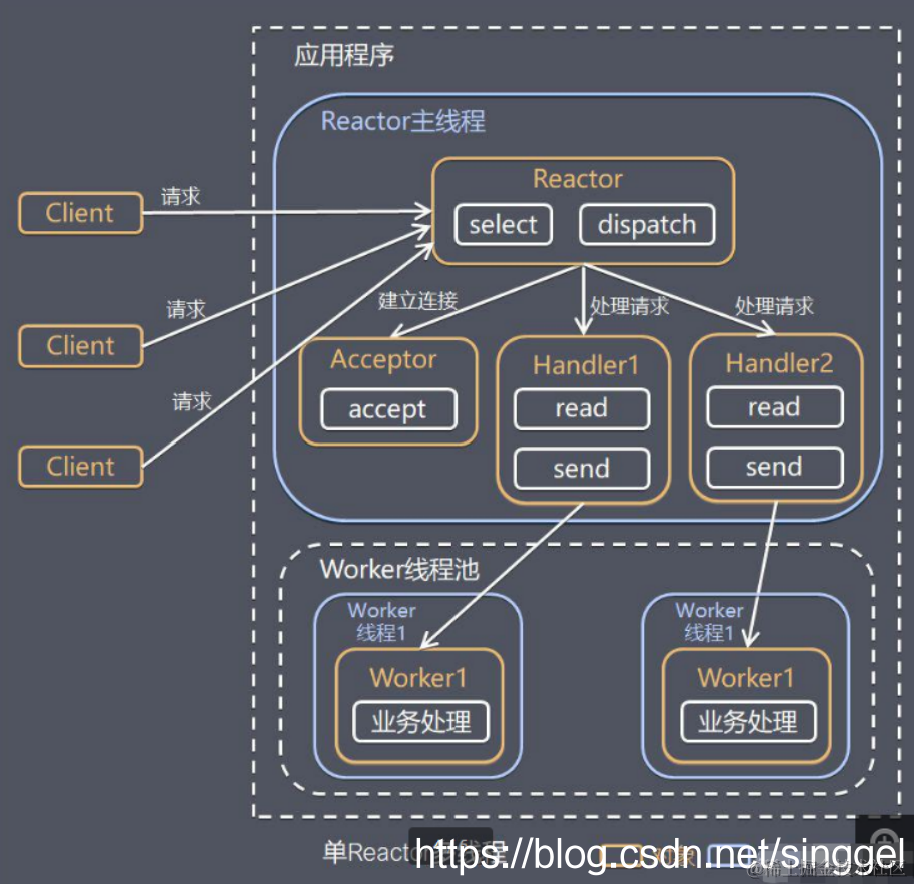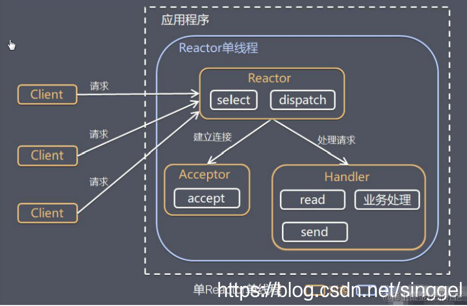 - 服务器端程序处理传入的多个请求,并将它们同步分派到相应的处理线程, 因此Reactor模式也叫 Dispatcher模式