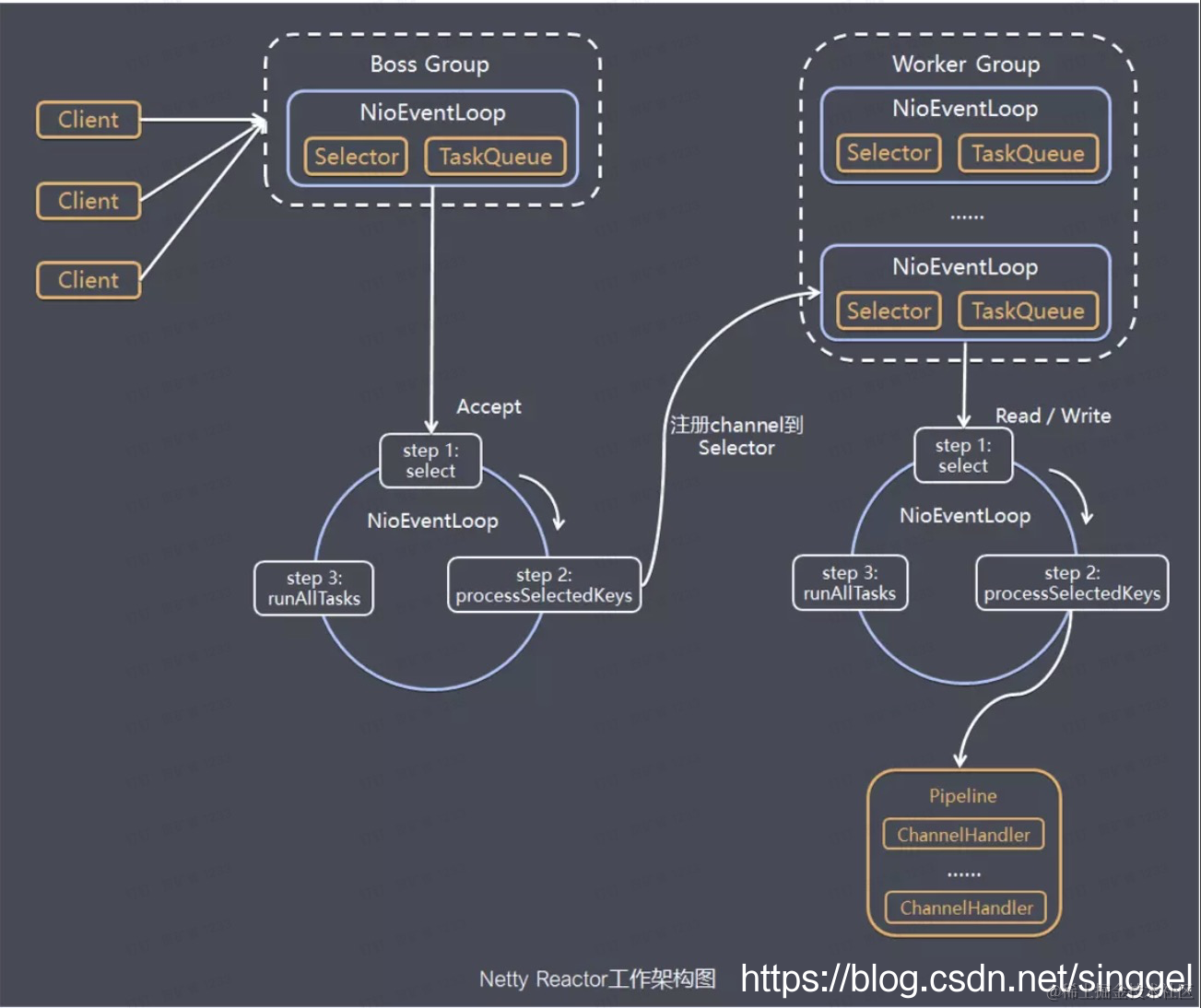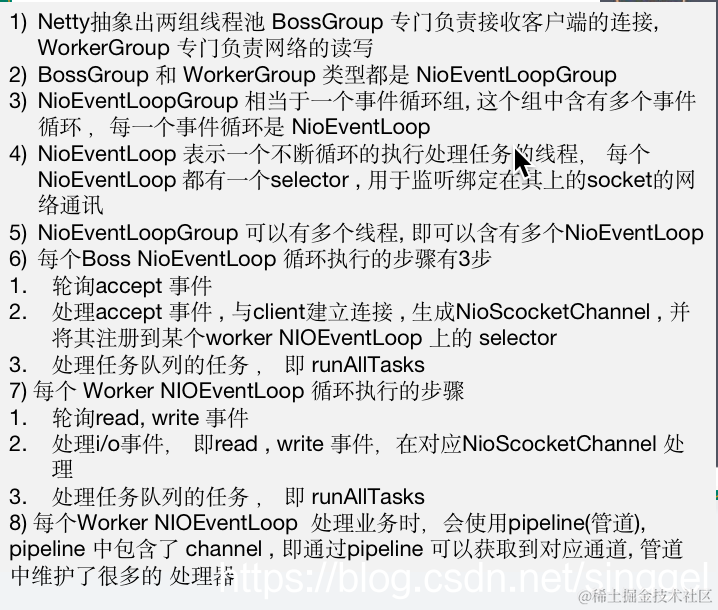 - 通常一个服务端口即一个 ServerSocketChannel对应一个Selector 和一个EventLoop线程。BossEventLoop 负责接收客户端的连接并将 SocketChannel 交给 WorkerEventLoopGroup 来进行 IO 处理