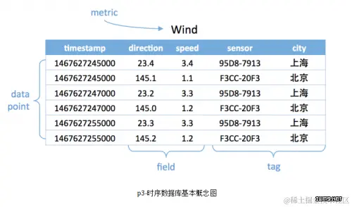 如下图,度量为Wind,每一个数据点都具有一个timestamp,两个field:direction和speed,两个tag:sensor、city。它的第一行和第三行,存放的都是sensor号码为95D8-7913的设备,属性城市是上海。随着时间的变化,风向和风速都发生了改变,风向从23.4变成23.2;而风速从3.4变成了3.3。