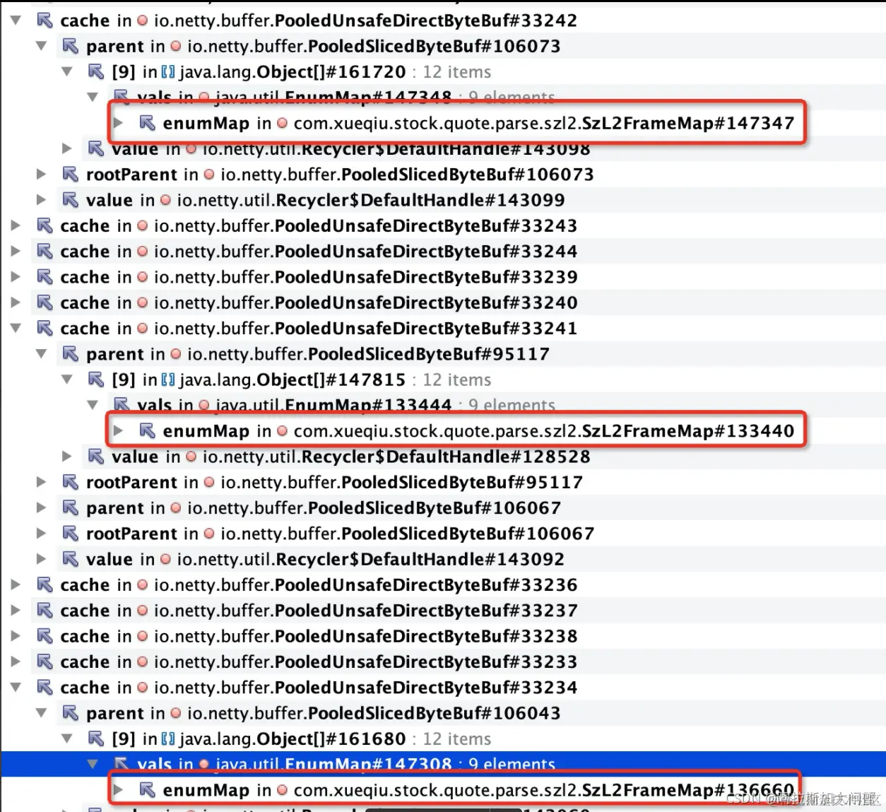 查看PooledUnsafeDirectByteBuf引用发现其最终关联到stock业务对象