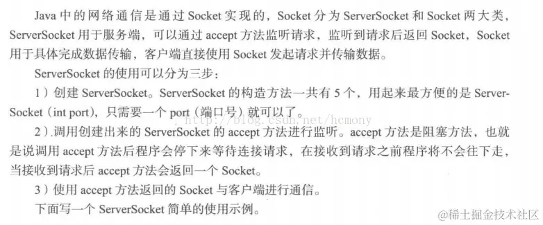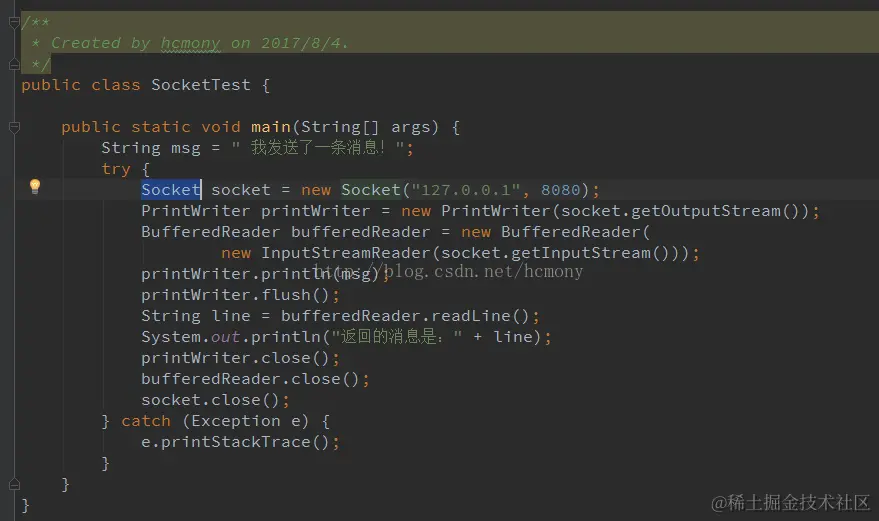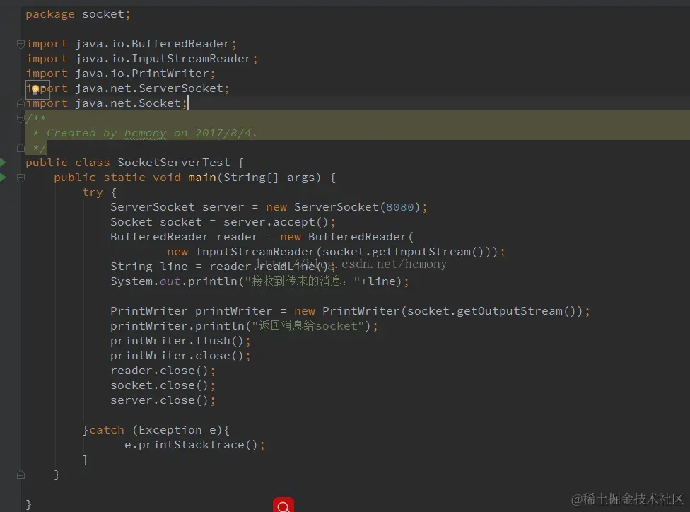 java 网络通信socket实现简单实例 程序员超哥 2021-10-26 156 阅读1分钟 Socket通信的步骤 ① 创建ServerSocket和Socket ② 打开连接到Socket的输入/输出流 ③ 按照协议对Socket进行读/写操作 ④ 关闭输入输出流、关闭Socket 服务器端: ① 创建ServerSocket对象,绑定监听端口 ② 通过accept()方法监听客户端请求 ③ 连接建立后,通过输入流读取客户端发送的请求信息 ④ 通过输出流向客户端发送乡音信息 ⑤ 关闭相关资源 \ \