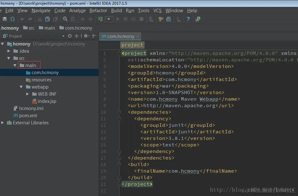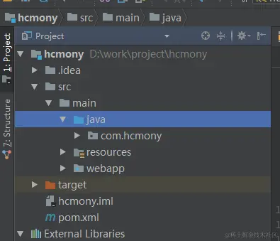6,打开的页面src下面main 里面有resources 和webapp 还有com.hcmony。
