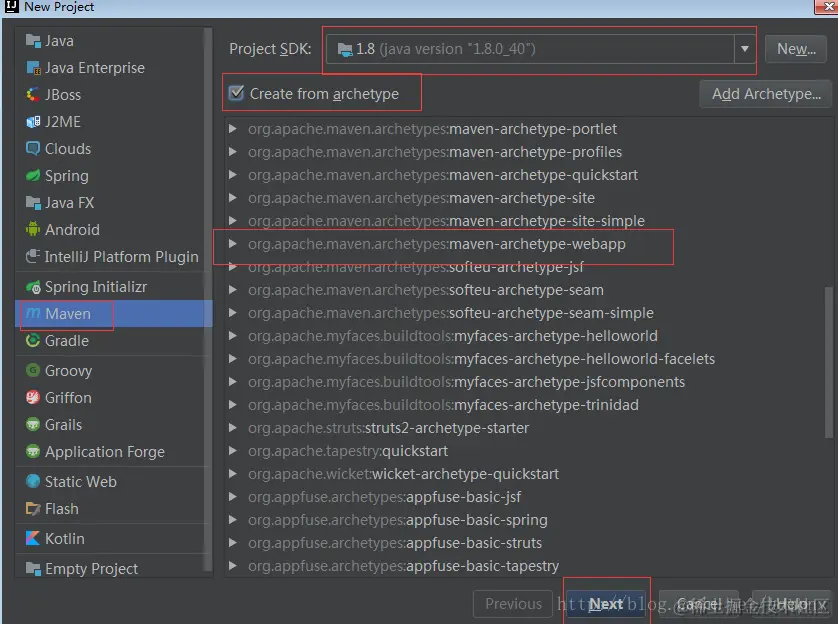 2,选择maven项目,sdk下拉框如果没有点击右边的new 找到自己安装的jdk。