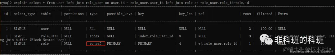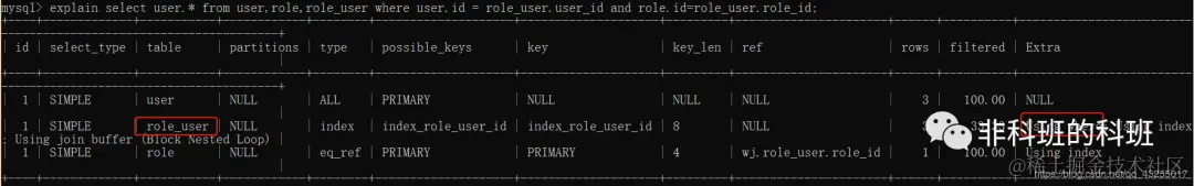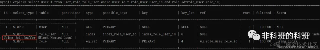 Using join buffer表示使用连接缓存:explain select user.* from user,role,role_user where user.id = role_user.user_id and role.id=role_user.role_id;