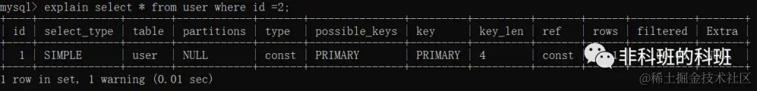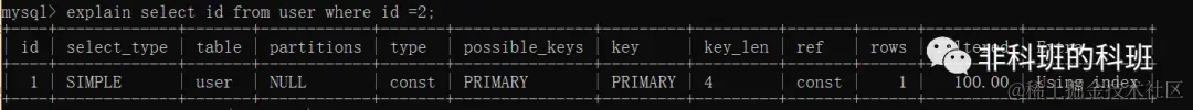 我们首先执行一条sql:explain select * from user where id =2;,执行后可以看到执行的结果如下: